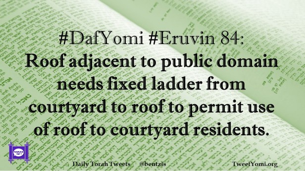DafYomi, Eruvin #DafYomi #Eruvin 84 Date: November 1, 2020Author: ysspitz #DafYomi #Eruvin 84: Roof adjacent to public domain needs fixed ladder from courtyard to roof to permit use of roof to courtyard residents. Share this: Share on X (Opens in new window) X Share on Facebook (Opens in new window) Facebook Like Loading... Related