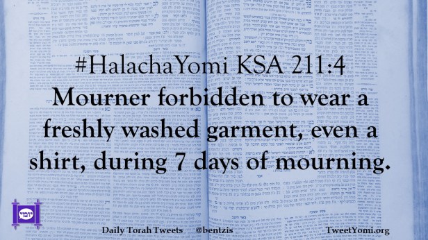 HalachaYomi #HalachaYomi KSA 211:4 Date: November 1, 2020Author: ysspitz #HalachaYomi KSA 211:4 Mourner forbidden to wear a freshly washed garment, even a shirt, during 7 days of mourning. Share this: Share on X (Opens in new window) X Share on Facebook (Opens in new window) Facebook Like Loading... Related