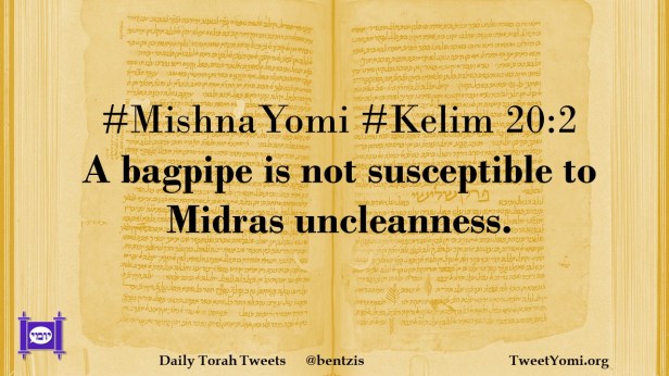 Kelim, MishnaYomi #MishnaYomi #Kelim 20:2 Date: November 1, 2020Author: ysspitz #MishnaYomi #Kelim 20:2 A bagpipe is not susceptible to Midras uncleanness. Share this: Share on X (Opens in new window) X Share on Facebook (Opens in new window) Facebook Like Loading... Related