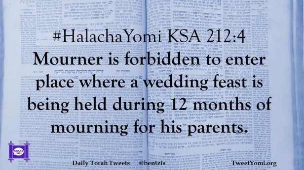 #HalachaYomi KSA 212:4 Mourner is forbidden to enter place where a wedding feast is being held during 12 months of mourning for his parents.
