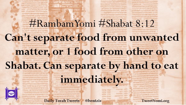 #RambamYomi #Shabat 8:12 Can’t separate food from unwanted matter, or 1 food from other on Shabat. Can separate by hand to eat immediately.