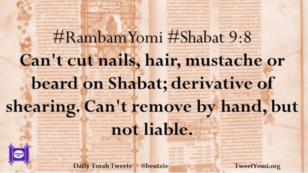 #RambamYomi #Shabat 9:8 Can’t cut nails, hair, mustache or beard on Shabat; derivative of shearing. Can’t remove by hand, but not liable.