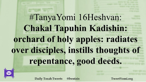 #TanyaYomi 16Heshvan: Chakal Tapuhin Kadishin: orchard of holy apples: radiates over disciples, instills thoughts of repentance, good deeds.
