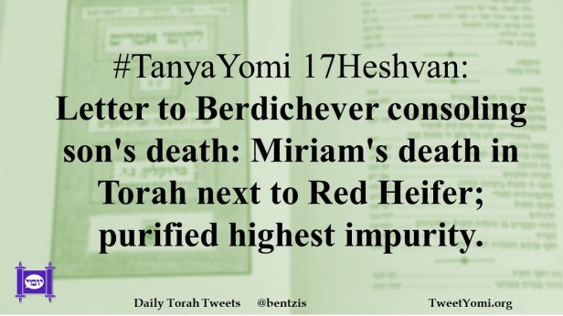 #TanyaYomi 17Heshvan: Letter to Berdichever consoling son’s death: Miriam’s death in Torah next to Red Heifer; purified highest impurity.