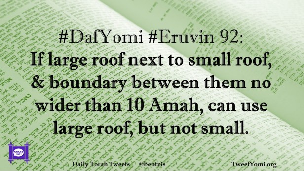 DafYomi, Eruvin #DafYomi #Eruvin 92 Date: November 13, 2020Author: ysspitz #DafYomi #Eruvin 92: If large roof next to small roof, & boundary between them no wider than 10 Amah, can use large roof, but not small. Share this: Share on X (Opens in new window) X Share on Facebook (Opens in new window) Facebook Like Loading... Related