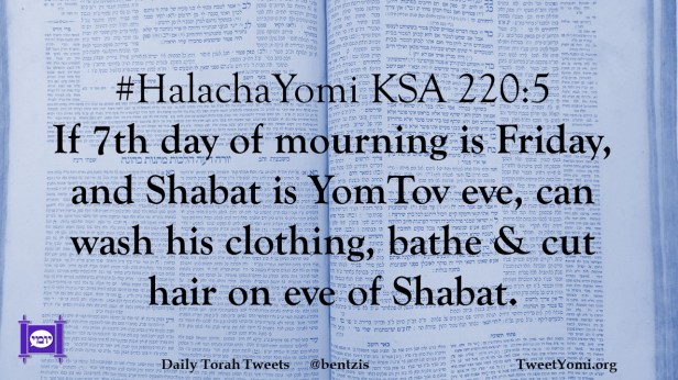 #HalachaYomi KSA 220:5 If 7th day of mourning is Friday, and Shabat is YomTov eve, can wash his clothing, bathe & cut hair on eve of Shabat.