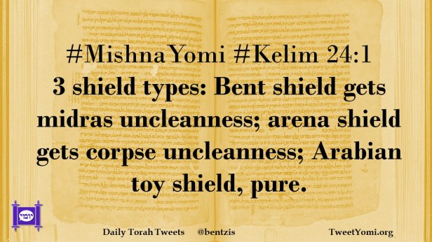 #MishnaYomi #Kelim 24:1 3 shield types: Bent shield gets midras uncleanness; arena shield gets corpse uncleanness; Arabian toy shield, pure.