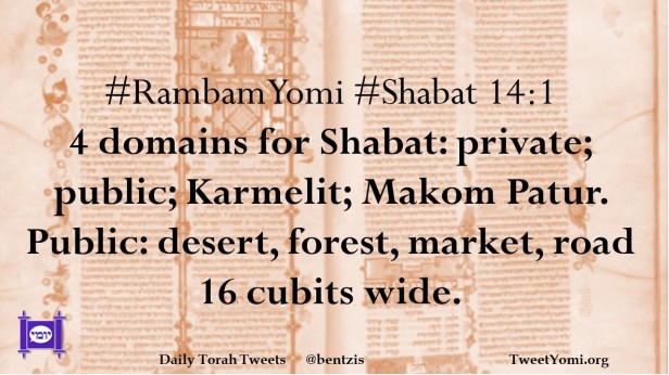#RambamYomi #Shabat 14:1 4 domains for Shabat: private; public; Karmelit; Makom Patur. Public: desert, forest, market, road 16 cubits wide.