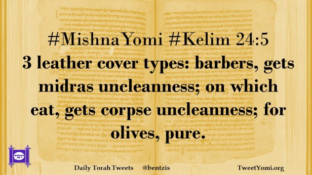 #MishnaYomi #Kelim 24:5 3 leather cover types: barbers, gets midras uncleanness; on which eat, gets corpse uncleanness; for olives, pure.