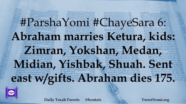 #ParshaYomi #ChayeSara 6: Abraham marries Ketura, kids: Zimran, Yokshan, Medan, Midian, Yishbak, Shuah. Sent east w/gifts. Abraham dies 175.