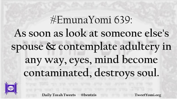#EmunaYomi 639: As soon as look at someone else’s spouse & contemplate adultery in any way, eyes, mind become contaminated, destroys soul.