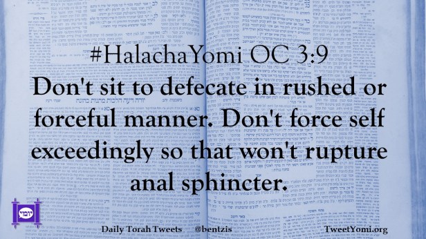 #HalachaYomi OC 3:9 Don’t sit to defecate in rushed or forceful manner. Don’t force self exceedingly so that won’t rupture anal sphincter.