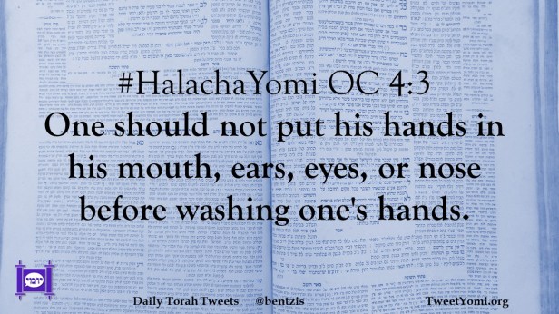 HalachaYomi #HalachaYomi OC 4:3 Date: December 11, 2020Author: ysspitz #HalachaYomi OC 4:3 One should not put his hands in his mouth, ears, eyes, or nose before washing one’s hands. Share this: Share on X (Opens in new window) X Share on Facebook (Opens in new window) Facebook Like Loading... Related
