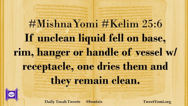 #MishnaYomi #Kelim 25:6 If unclean liquid fell on base, rim, hanger or handle of vessel w/ receptacle, one dries them and they remain clean.