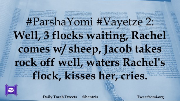 #ParshaYomi #Vayetze 2: Well, 3 flocks waiting, Rachel comes w/ sheep, Jacob takes rock off well, waters Rachel’s flock, kisses her, cries.