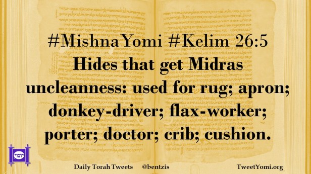 #MishnaYomi #Kelim 26:5 Hides that get Midras uncleanness: used for rug; apron; donkey-driver; flax-worker; porter; doctor; crib; cushion.