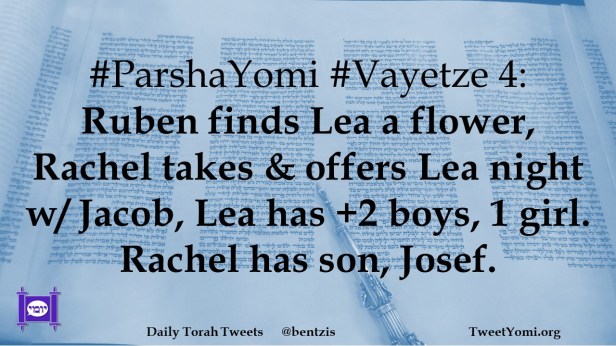 #ParshaYomi #Vayetze 4: Ruben finds Lea a flower, Rachel takes & offers Lea night w/ Jacob, Lea has +2 boys, 1 girl. Rachel has son, Josef.