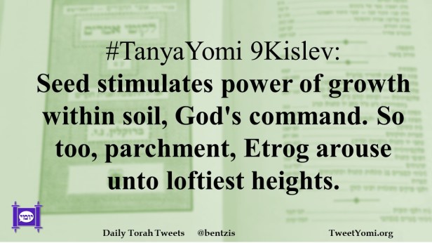 #TanyaYomi 9Kislev: Seed stimulates power of growth within soil, God’s command. So too, parchment, Etrog arouse unto loftiest heights.