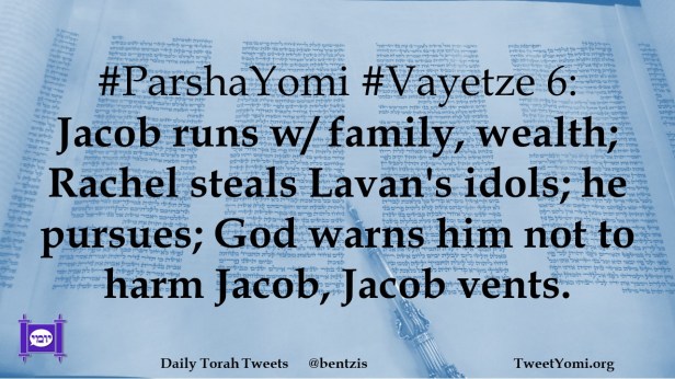 #ParshaYomi #Vayetze 6: Jacob runs w/ family, wealth; Rachel steals Lavan’s idols; he pursues; God warns him not to harm Jacob, Jacob vents.