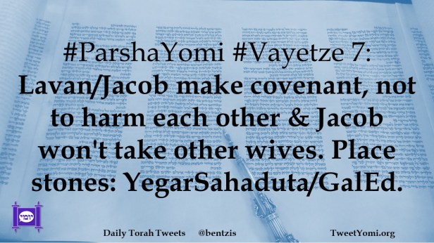 #ParshaYomi #Vayetze 7: Lavan/Jacob make covenant, not to harm each other & Jacob won’t take other wives. Place stones: YegarSahaduta/GalEd.