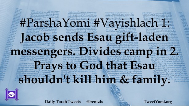 #ParshaYomi #Vayishlach 1: Jacob sends Esau gift-laden messengers. Divides camp in 2. Prays to God that Esau shouldn’t kill him & family.