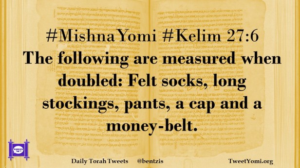 Kelim, MishnaYomi #MishnaYomi #Kelim 27:6 Date: December 18, 2020Author: ysspitz #MishnaYomi #Kelim 27:6 The following are measured when doubled: Felt socks, long stockings, pants, a cap and a money-belt. Share this: Share on X (Opens in new window) X Share on Facebook (Opens in new window) Facebook Like Loading... Related
