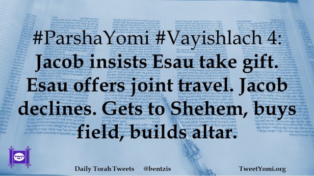 #ParshaYomi #Vayishlach 4: Jacob insists Esau take gift. Esau offers joint travel. Jacob declines. Gets to Shehem, buys field, builds altar.