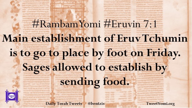 #RambamYomi #Eruvin 7:1 Main establishment of Eruv Tchumin is to go to place by foot on Friday. Sages allowed to establish by sending food.