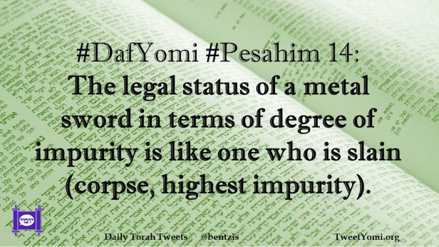 DafYomi, Pesahim #DafYomi #Pesahim 14 Date: December 25, 2020Author: ysspitz #DafYomi #Pesahim 14: The legal status of a metal sword in terms of degree of impurity is like one who is slain (corpse, highest impurity). Share this: Share on X (Opens in new window) X Share on Facebook (Opens in new window) Facebook Like Loading... Related