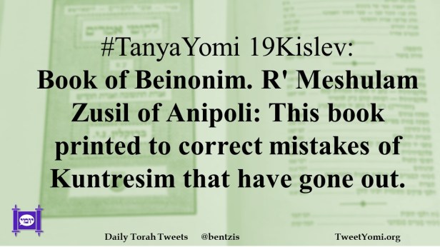 #TanyaYomi 19Kislev: Book of Beinonim. R’ Meshulam Zusil of Anipoli: This book printed to correct mistakes of Kuntresim that have gone out.