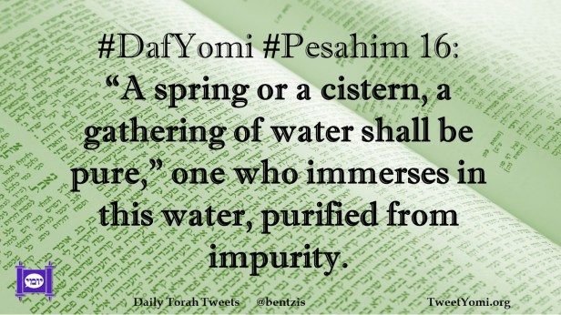 DafYomi, Pesahim #DafYomi #Pesahim 16 Date: January 4, 2021Author: ysspitz #DafYomi #Pesahim 16: “A spring or a cistern, a gathering of water shall be pure,” one who immerses in this water, purified from impurity. Share this: Share on X (Opens in new window) X Share on Facebook (Opens in new window) Facebook Like Loading... Related
