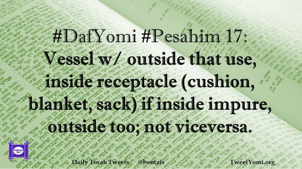 DafYomi, Pesahim #DafYomi #Pesahim 17 Date: January 4, 2021Author: ysspitz #DafYomi #Pesahim 17: Vessel w/ outside that use, inside receptacle (cushion, blanket, sack) if inside impure, outside too; not viceversa. Share this: Share on X (Opens in new window) X Share on Facebook (Opens in new window) Facebook Like Loading... Related