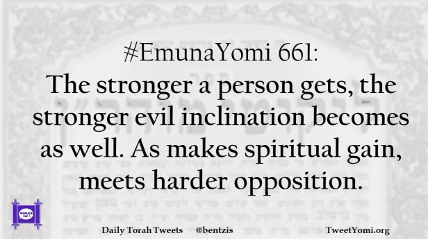 #EmunaYomi 661: The stronger a person gets, the stronger evil inclination becomes as well. As makes spiritual gain, meets harder opposition.