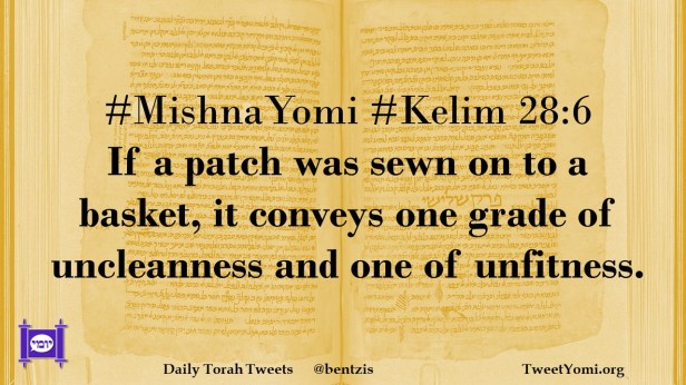 Kelim, MishnaYomi #MishnaYomi #Kelim 28:6 Date: January 4, 2021Author: ysspitz #MishnaYomi #Kelim 28:6 If a patch was sewn on to a basket, it conveys one grade of uncleanness and one of unfitness. Share this: Share on X (Opens in new window) X Share on Facebook (Opens in new window) Facebook Like Loading... Related