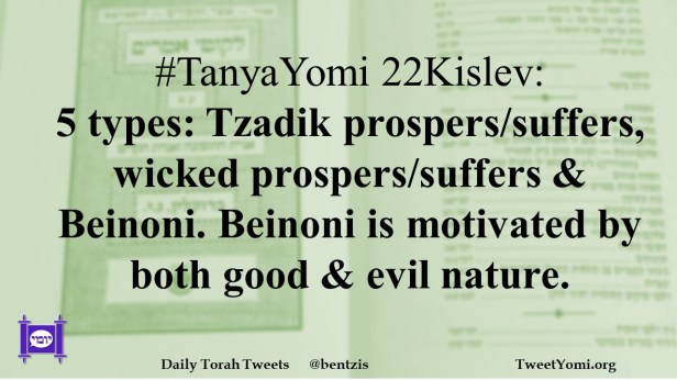#TanyaYomi 22Kislev: 5 types: Tzadik prospers/suffers, wicked prospers/suffers & Beinoni. Beinoni is motivated by both good & evil nature.
