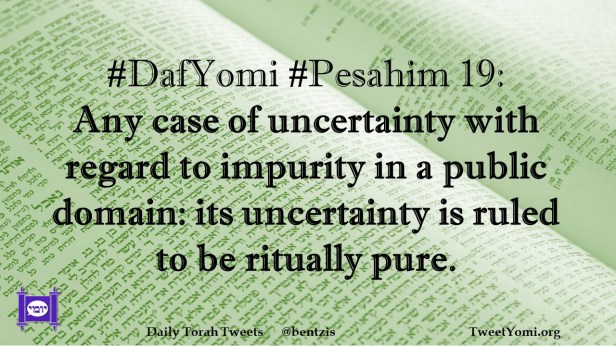 DafYomi, Pesahim #DafYomi #Pesahim 19 Date: January 5, 2021Author: ysspitz #DafYomi #Pesahim 19: Any case of uncertainty with regard to impurity in a public domain: its uncertainty is ruled to be ritually pure. Share this: Share on X (Opens in new window) X Share on Facebook (Opens in new window) Facebook Like Loading... Related