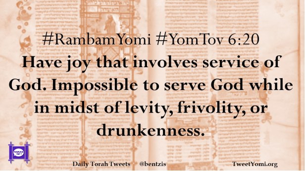 #RambamYomi #YomTov 6:20 Have joy that involves service of God. Impossible to serve God while in midst of levity, frivolity, or drunkenness.
