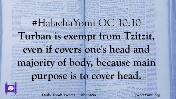 #HalachaYomi OC 10:10 Turban is exempt from Tzitzit, even if covers one’s head and majority of body, because main purpose is to cover head.