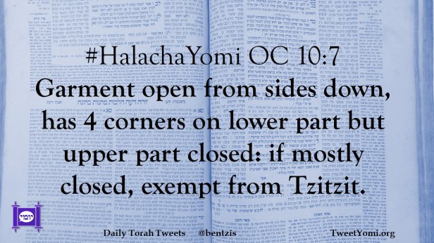 #HalachaYomi OC 10:7 Garment open from sides down, has 4 corners on lower part but upper part closed: if mostly closed, exempt from Tzitzit.