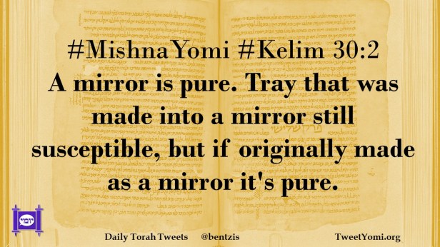 #MishnaYomi #Kelim 30:2 A mirror is pure. Tray that was made into a mirror still susceptible, but if originally made as a mirror it’s pure.