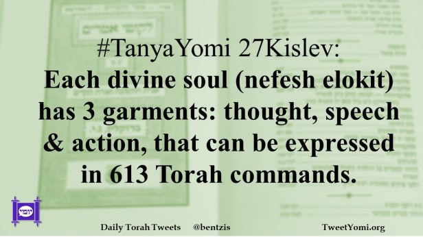 #TanyaYomi 27Kislev: Each divine soul (nefesh elokit) has 3 garments: thought, speech & action, that can be expressed in 613 Torah commands.