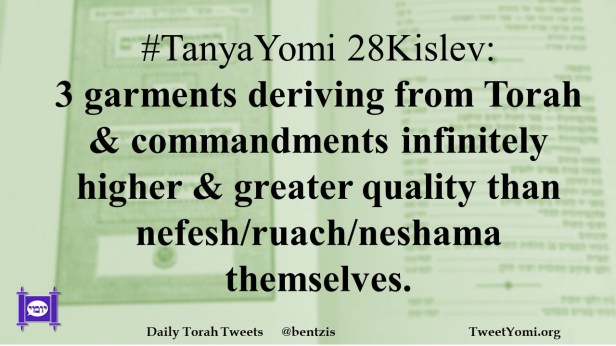 #TanyaYomi 28Kislev: 3 garments deriving from Torah & commandments infinitely higher & greater quality than nefesh/ruach/neshama themselves.