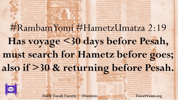#RambamYomi #HametzUmatza 2:19 Has voyage <30 days before Pesah, must search for Hametz before goes; also if >30 & returning before Pesah.