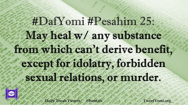 DafYomi, Pesahim #DafYomi #Pesahim 25 Date: January 17, 2021Author: ysspitz #DafYomi #Pesahim 25: May heal w/ any substance from which can’t derive benefit, except for idolatry, forbidden sexual relations, or murder. Share this: Share on X (Opens in new window) X Share on Facebook (Opens in new window) Facebook Like Loading... Related