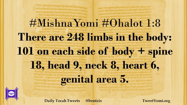 #MishnaYomi #Ohalot 1:8 There are 248 limbs in the body: 101 on each side of body + spine 18, head 9, neck 8, heart 6, genital area 5.
