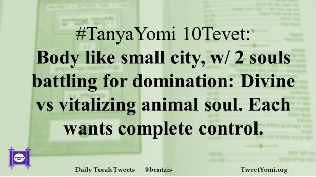 #TanyaYomi 10Tevet: Body like small city, w/ 2 souls battling for domination: Divine vs vitalizing animal soul. Each wants complete control.