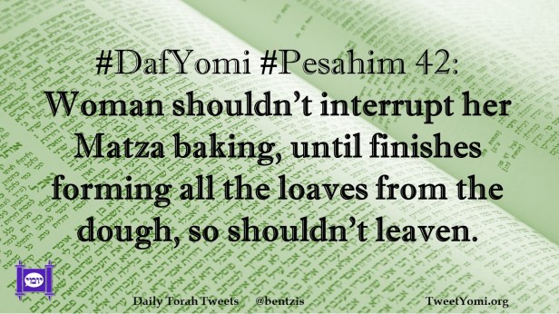 DafYomi, Pesahim #DafYomi #Pesahim 42 Date: February 23, 2021Author: ysspitz #DafYomi #Pesahim 42: Woman shouldn’t interrupt her Matza baking, until finishes forming all the loaves from the dough, so shouldn’t leaven. Share this: Share on X (Opens in new window) X Share on Facebook (Opens in new window) Facebook Like Loading... Related