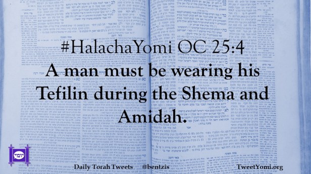 HalachaYomi #HalachaYomi OC 25:4 Date: February 23, 2021Author: ysspitz #HalachaYomi OC 25:4 A man must be wearing his Tefilin during the Shema and Amidah. Share this: Share on X (Opens in new window) X Share on Facebook (Opens in new window) Facebook Like Loading... Related
