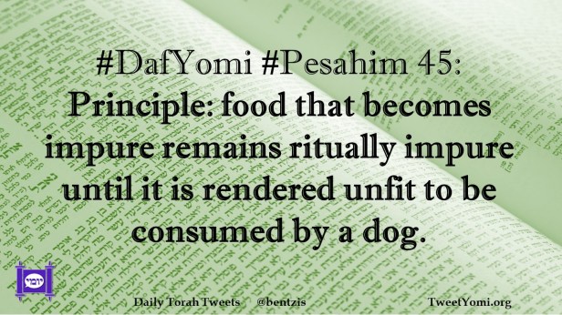 DafYomi, Pesahim #DafYomi #Pesahim 45 Date: February 24, 2021Author: ysspitz #DafYomi #Pesahim 45: Principle: food that becomes impure remains ritually impure until it is rendered unfit to be consumed by a dog. Share this: Share on X (Opens in new window) X Share on Facebook (Opens in new window) Facebook Like Loading... Related