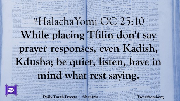 #HalachaYomi OC 25:10 While placing Tfilin don’t say prayer responses, even Kadish, Kdusha; be quiet, listen, have in mind what rest saying.